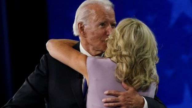 مصدر الصورةREUTERSImage captionجو بايدن ياعنق زوجته بعد إلقاء كلمته
